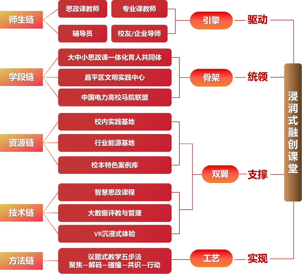 “五链融合”,即师资链(“思政教师+专业课教师+辅导员+校友/企业导师”协同教研共同体),学段链(昌平区大中小学思政课一体化育人共同体、昌平区文明实践中心和中国电力高校马克思主义学院联盟),资源链(校内实践基地、行业能源基地、校本递进式主题展等),技术链(思政智能体的精准教学和学习数据的动态检测),方法链(“聚焦-解码-碰撞-共识-行动”议题式教学五步法)。师资链是“引擎”,学段链是“骨架”,资源链和技术链合为“双翼”,方法链为“工艺”,分别为浸润式融创大课堂提供驱动、统领、支撑和实现的作用。“五链融合”力求将思想政治教育主渠道与主阵地相结合、理论建设与能力建设相结合、学校力量与社会力量相结合。从而实现三全育人在“全”上发力、在“贯通”中求实效的目标不断线不掉档。