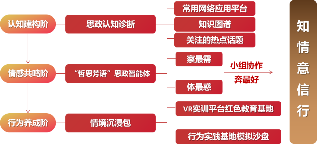 大学生对于思政课“碎片化”现象比较严重,“00”后大学生通过短视频获取政治信息的比例达73%,价值判断“二元化”趋向显现,42%的学生难以用辩证思维分析复杂议题(数据源于“2023年大学生媒介素养报告”)。认知隔阂的存在,需要思政课搭建理论联通现实的“认知脚手架”。一阶为认知建构阶,运用“思政认知诊断”精准识别学生知识的掌握和成长的需求,配套“知识图谱”学习模块,链接国家需求、行业要求和成长需求的强联系。二阶为“情感共鸣阶”,依托校本化智慧思政智能体“哲思芳语”,捕捉问题、解析问题,为高度竞争下“孤独的大学生”提供陪伴,提供答案。三阶为行为养成阶,依靠VR实训平台,设计“情境沉浸包”(VR红色教育基地/行业实践基地模拟沙盘),实施“能源报国知行合一”成长积分制,对接思政实践课堂。