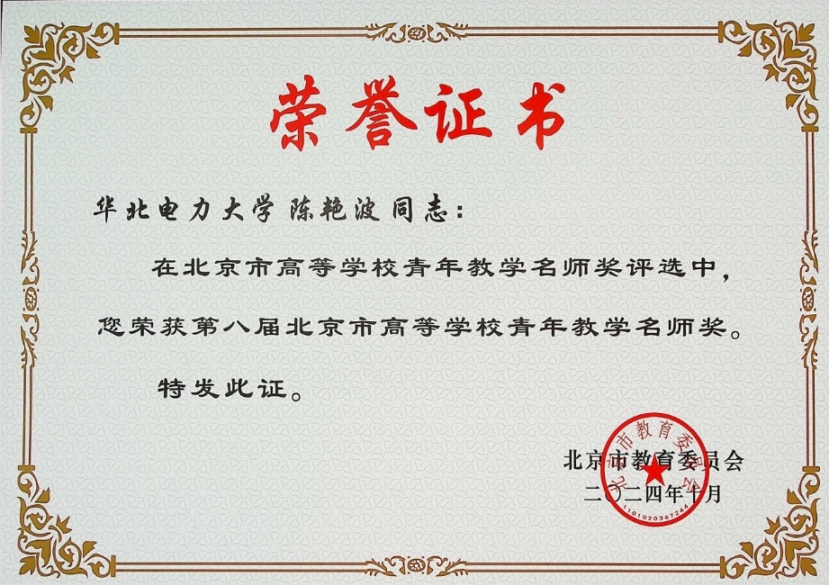 陈艳波,第八届北京市高等学校青年教学名师奖,颁发单位北京市教育委员会,2024年;