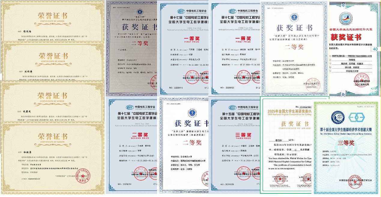 涵盖水利创新、软件设计、电力创新、电工数学建模等多个核心领域,包括第九届全国大学生水利创新设计大赛特等奖、第十二届“中国软件杯”大学生软件设计大赛一等奖4项、“象新力杯”全国大学生电力创新设计竞赛二等奖2项、第十七届“中国电机工程学会杯”全国大学生电工数学建模竞赛一等奖2项及二等奖1项、第十五届“中国电机工程学会杯”全国大学生电工数学建模竞赛三等奖、2025年全国大学生英语竞赛三等奖、第十届全国大学生能源经济学术创意大赛三等奖等。