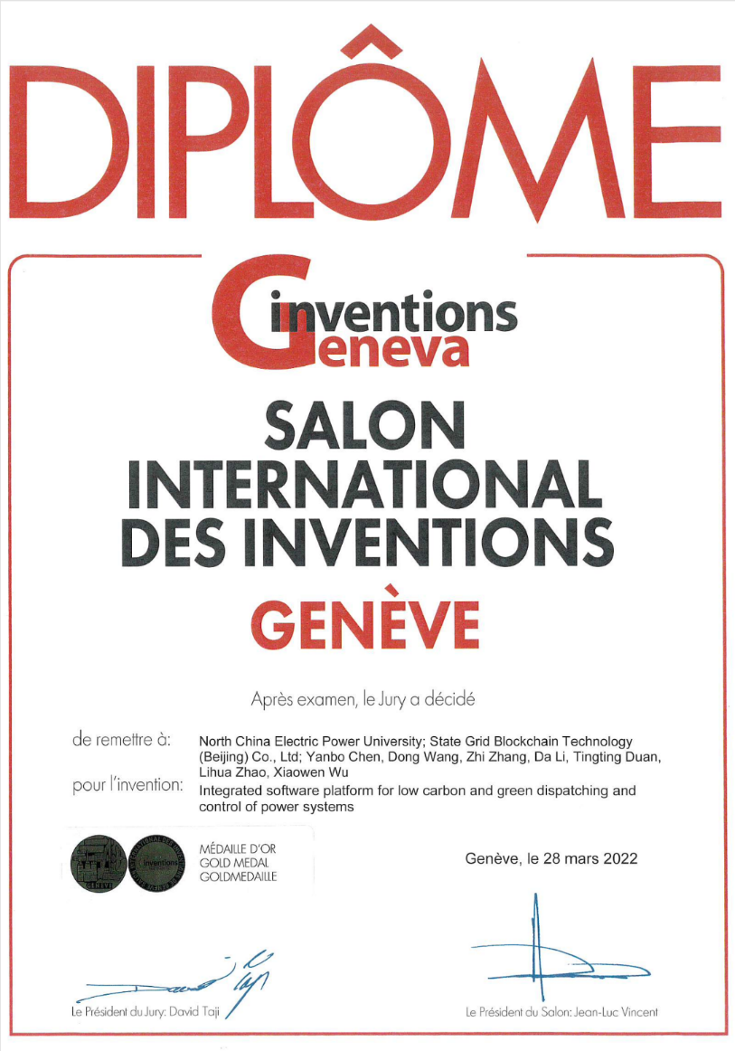 陈艳波、张智,日内瓦国际发明展金奖,成果名称“Integrated software platform for low carbon and green dispatching and control of power systems(低碳绿色电力系统调度与控制集成软件平台)”,颁发单位瑞士联邦政府、世界知识产权组织,2022年。