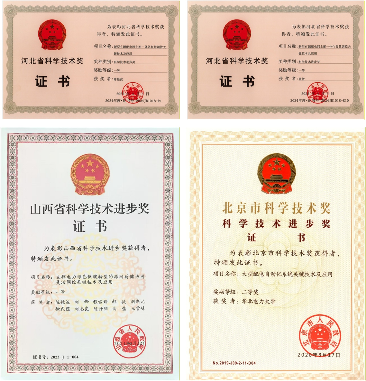 1) 陈艳波、张智,河北省科技进步一等奖,成果名称“新型有源配电网主配一体化智慧调控关键技术及应用”,颁发单位河北省人民政府,2024年;