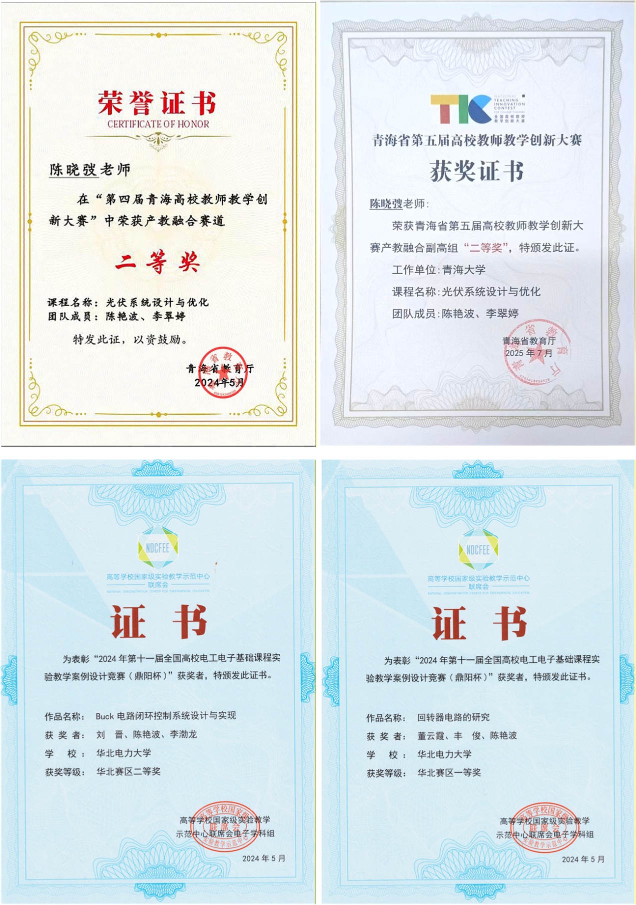 1) 陈艳波,第四届青海高校教师教学创新大赛,成果名称《光伏系统设计与优化》,颁发单位为青海省教育厅,2024年;