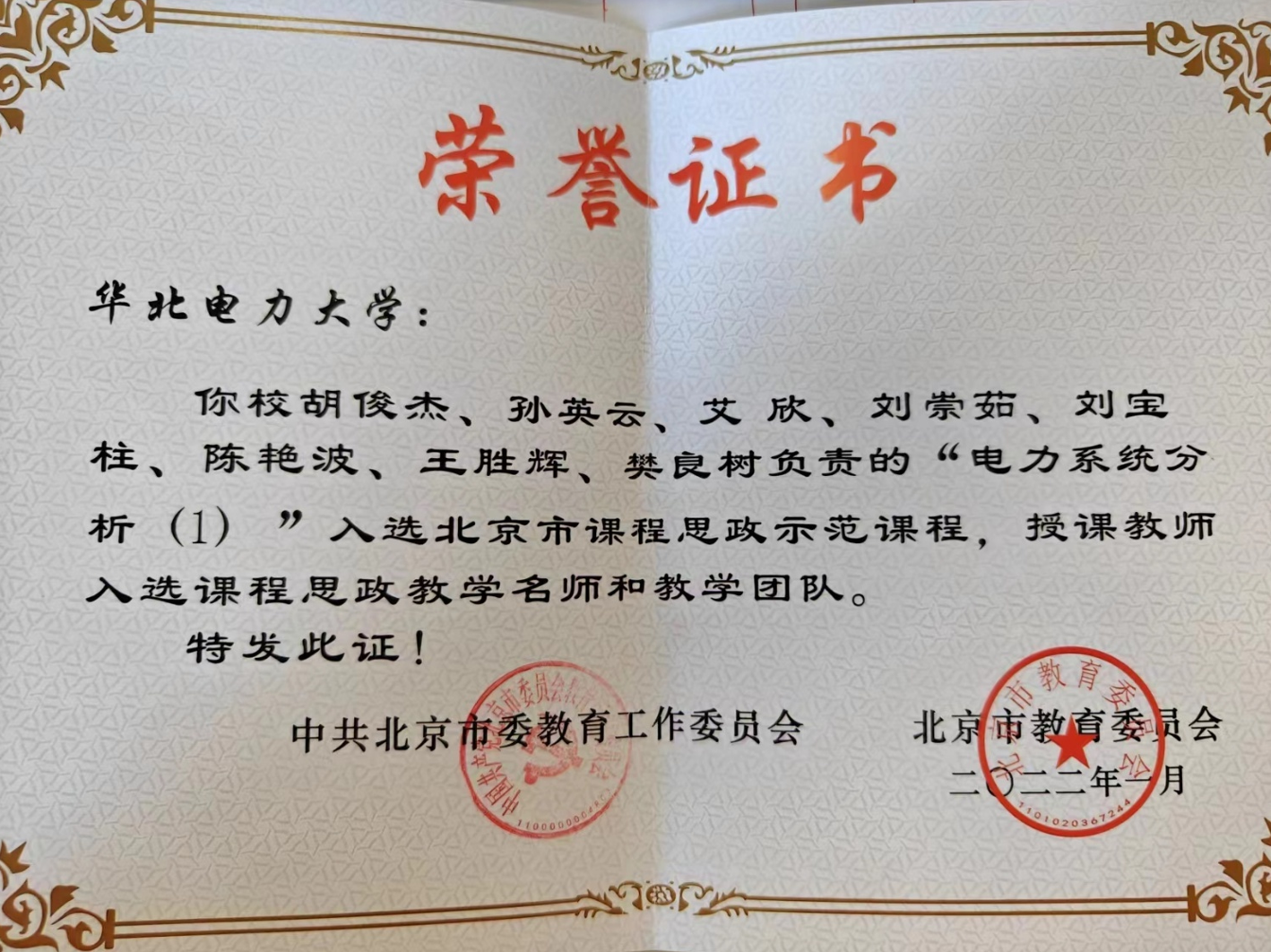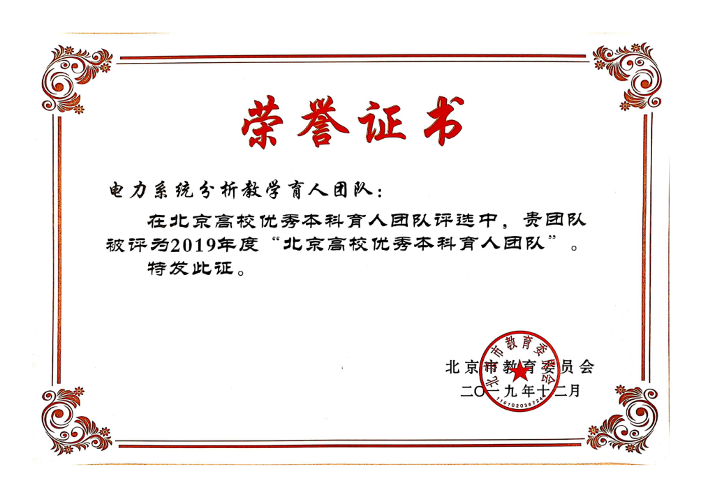 陈艳波、刘崇茹、李庚银、艾欣、齐郑、孙英云,2019年度“北京高校优秀本科育人团队”,颁发单位为北京市教育委员会,2019年;