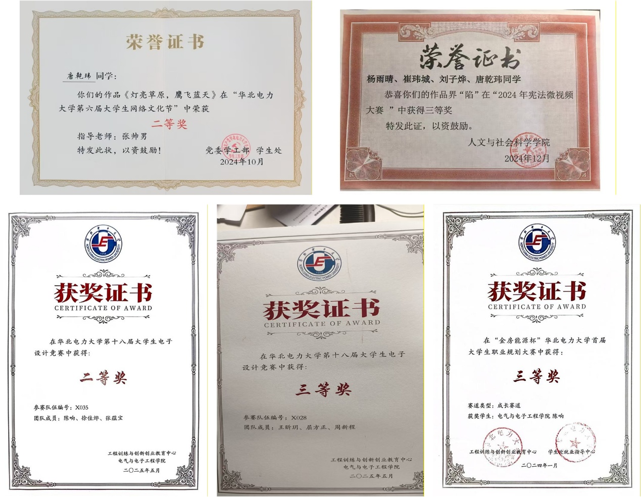 覆盖电子设计、职业规划、宪法宣传、网络文化等多个维度,包括华北电力大学第十八届大学生电子设计竞赛二等奖2项、“金房能源杯”华北电力大学首届大学生职业规划大赛三等奖、“2024年宪法微视频大赛”三等奖、华北电力大学第六届大学生网络文化节二等奖。