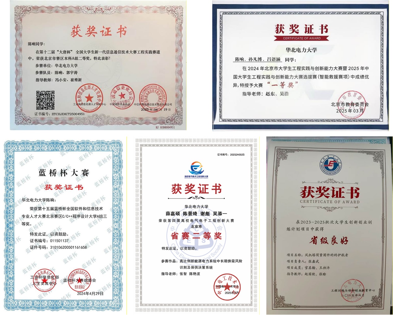 聚焦电气电子创新、工程实践、信息通信技术等专业方向,包括第四届高校电气电子工程创新大赛北京市二等奖、2024年北京市大学生工程实践与创新能力大赛一等奖、第十二届“大唐杯”全国大学生新一代信息通信技术大赛工程实践赛道二等奖、第十五届蓝桥杯全国软件和信息技术专业人才大赛北京赛区三等奖、大学生创新创业训练计划项目省级良好。