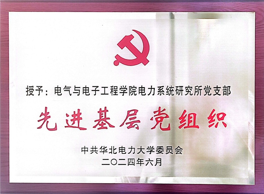 1) 电气与电子工程学院电力系统研究所党支部,华北电力大学先进基层党组织,颁发单位中共华北电力大学委员会,2024年;