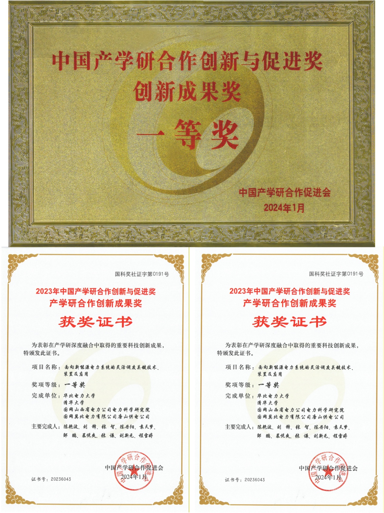 陈艳波、张智,中国产学研合作创新与促进奖—产学研合作创新成果奖一等奖,成果名称“面向新能源电力系统的灵活调度关键技术、装置及应用”,颁发单位中国产学研合作促进会,2023年。