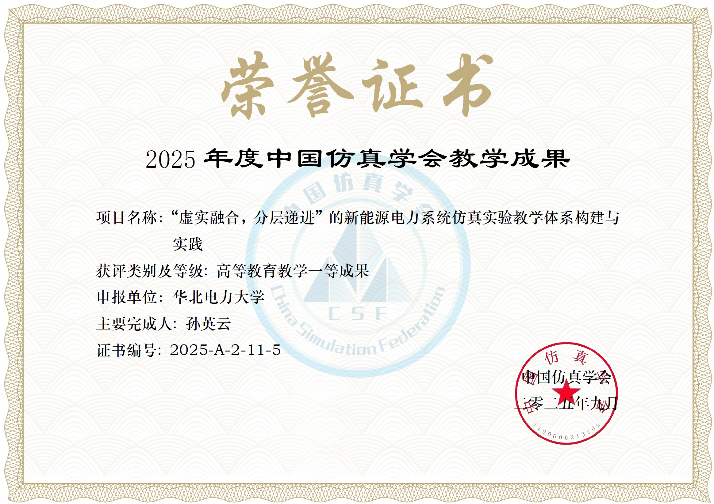 陈艳波、刘崇茹、李庚银、艾欣、孙英云,2025年度中国仿真学会教学成果奖(学会级,等同国家级相关认可),成果名称为“虚实融合,分层递进” 的新能源电力系统仿真实验教学体系构建与实践,2025年;