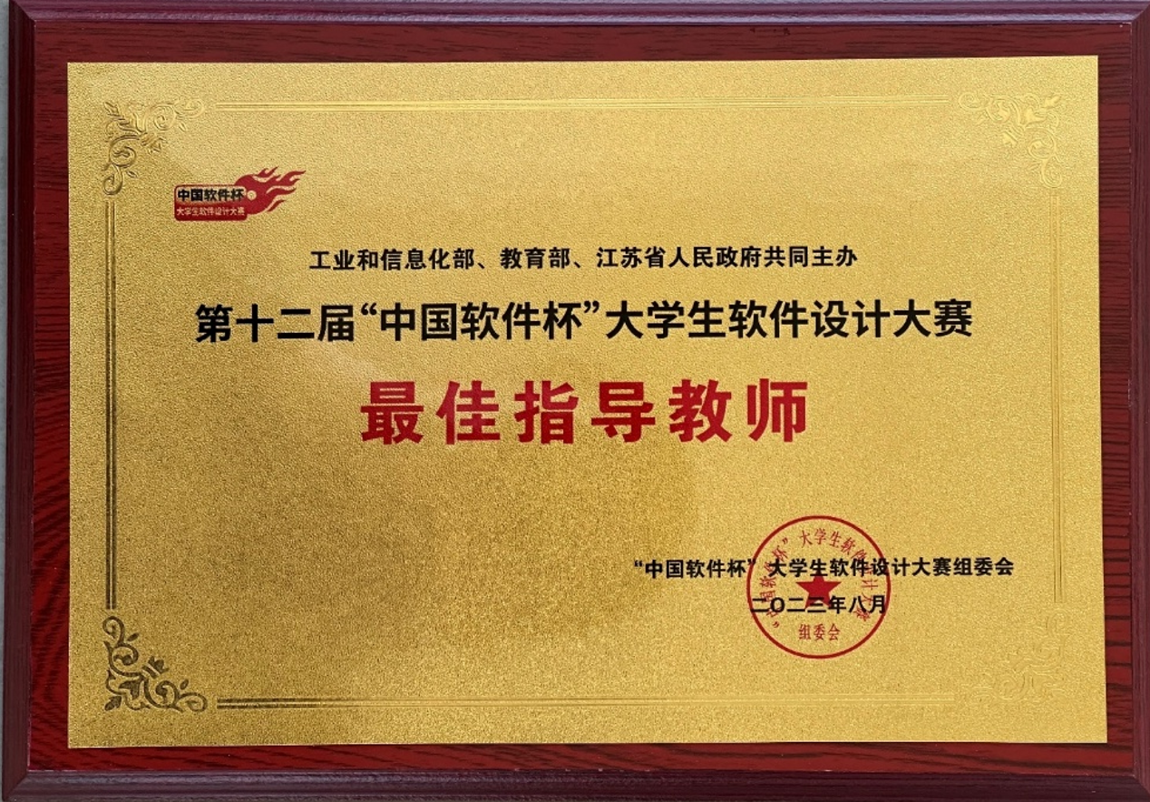 陈艳波,第十二届“中国软件杯”大学生软件设计大赛最佳指导教师,颁发单位为工业和信息化部、教育部、江苏省人民政府,2023年。