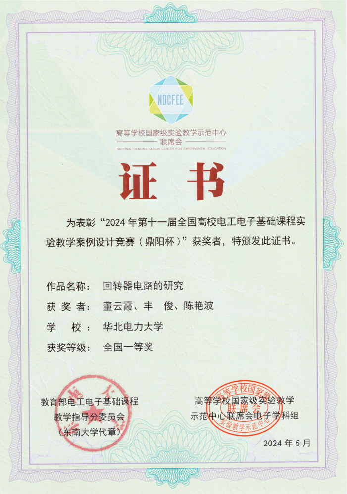 4) 董云霞、丰俊、陈艳波,2024年第十一届全国高校电工电子基础课程实验教学案例设计竞赛华北赛区一等奖,成果名称《回转器电路的研究》,颁发单位为高等学校国家级实验教学示范中心联席会电子学科组,2024年;