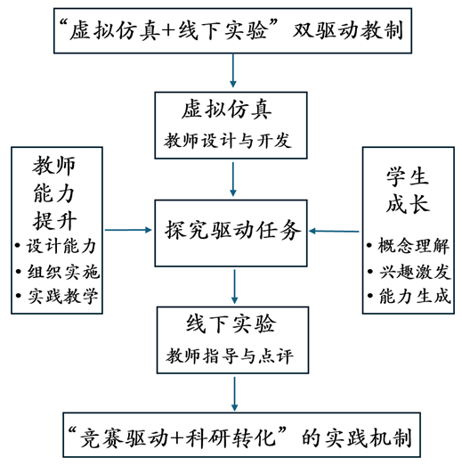 面向复合型人才培养需求,工作室鼓励青年教师开展探究式实验教学改革,构建“虚拟仿真+线下实验”双驱动教学模式,强化实验教学的实践导向与创新特性: